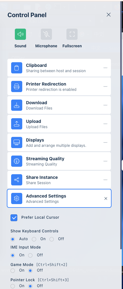 销毁之前的 Workspace Session,运行新的 Workspace Session,打开左侧的配置菜单,找到 Advanced Settings ,将 IME Input Mode 配置为 On