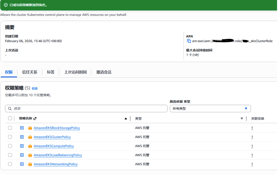 每个集群都需要一个 Amazon EKS 集群 IAM 角色。由 Amazon EKS 管理的 Kubernetes 集群会使用此角色来管理节点